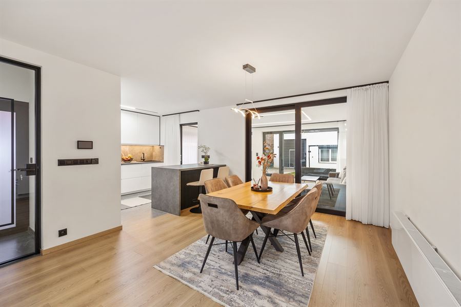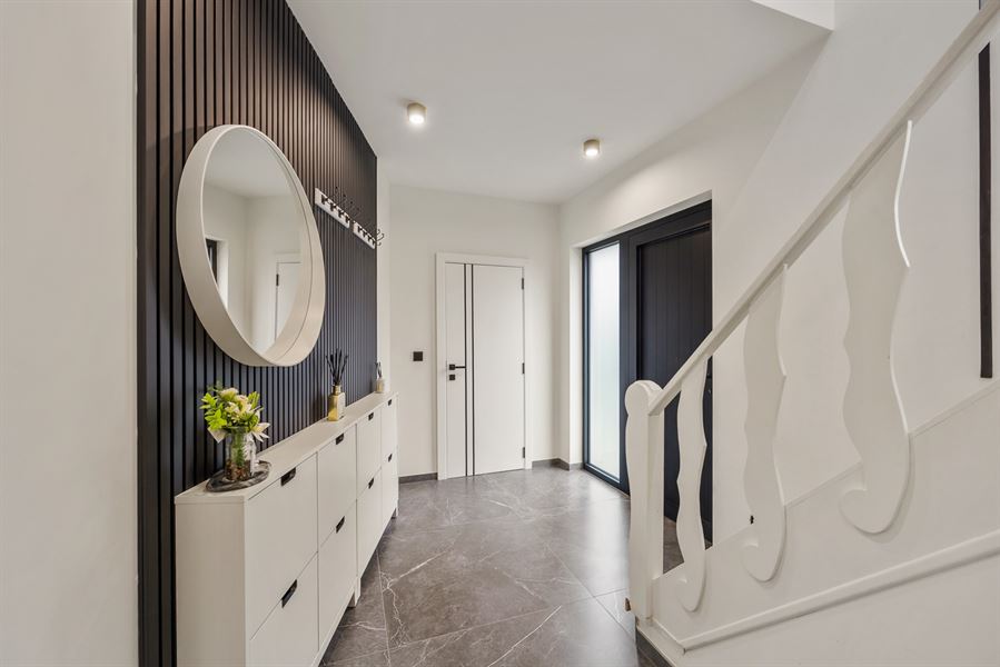 Verzorgde inkomhall met gastentoilet. Doorzonwoonkamer met gezellige haard. Open keuken voorzien van alle comfort.