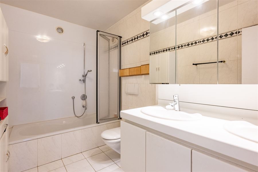 In de badkamer is er een meubel met 2 lavabo's, een ligbad met douchescherm en een tweede WC.