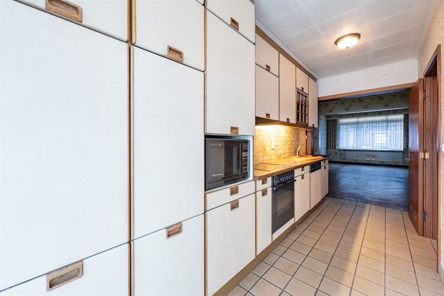 Inkomhall met daarachter een sas met een gastentoilet en een vestiairekast. Woonkamer (7,91 x 4,23) met een visgraatparket. In het verlengde een ingerichte verouderde keuken met terzijde een berging. Schuifraam naar de tuin.